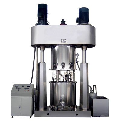 雙行星混合攪拌機(jī) 雙行星混合機(jī)的攪拌槳葉,在公轉(zhuǎn)的同時(shí)也自轉(zhuǎn),使罐體內(nèi)物料上下及四周循環(huán)運(yùn)動(dòng),從而可在很短時(shí)間內(nèi)達(dá)到混臺(tái)(混煉)效果,罐體內(nèi)壁為大型立車精加工,再經(jīng)大型拋光機(jī)自動(dòng)拋光,確保行星箱上的活動(dòng)刮刀在旋轉(zhuǎn)時(shí),把輩體內(nèi)壁上的物料刮掉,該機(jī)特別適合從粉體到高黏度,高密度的物料溶解,混合,混煉,反應(yīng)工藝,廣泛應(yīng)用于電池,有機(jī)硅膠、油墨、染料、粘膠劑、高粘度涂料等化工產(chǎn)品