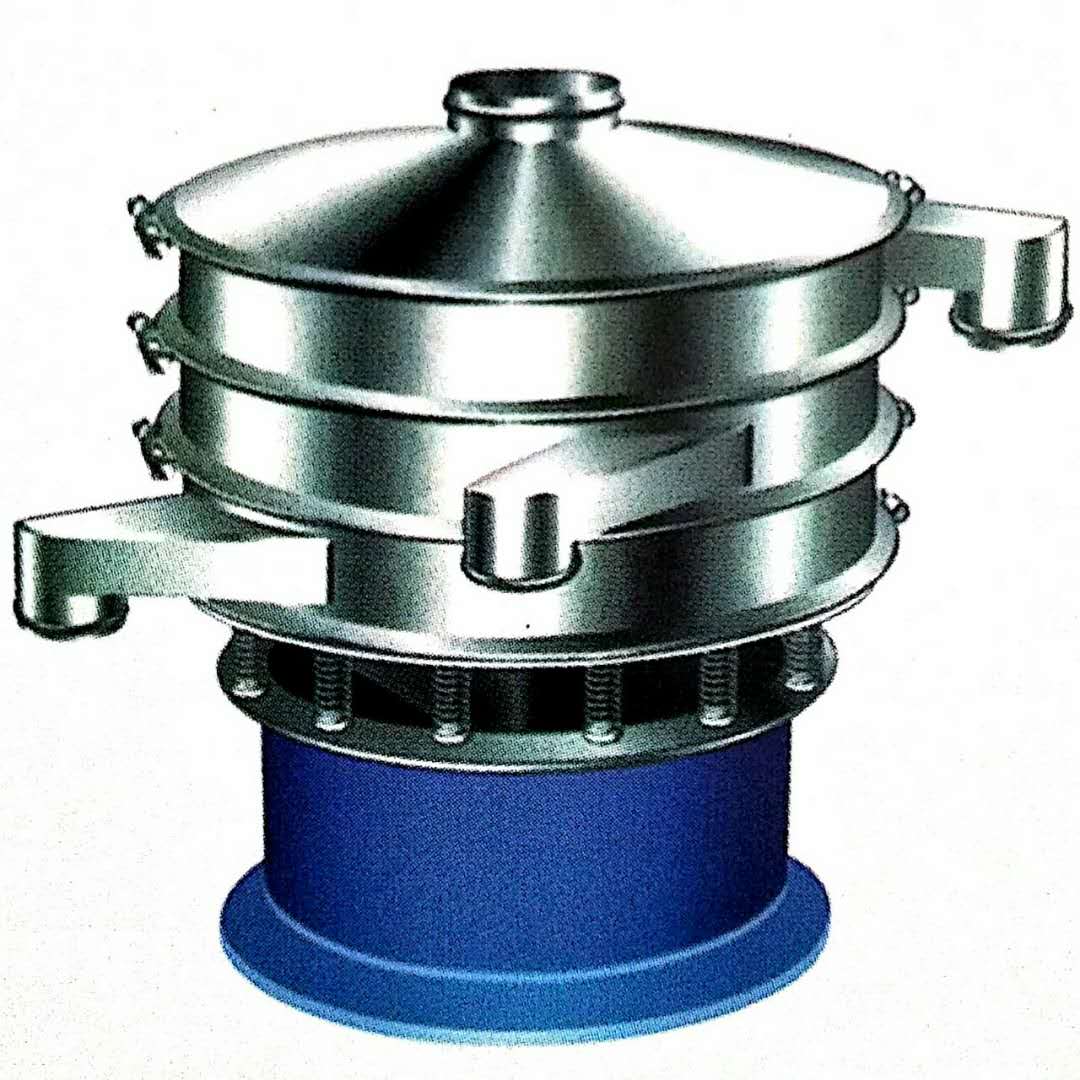 多層干粉液體振動篩由立式振動電機作激振源,振動電機上、下兩端安裝有偏心重錘,將振動電機的旋轉運動轉變為水平、垂直、傾斜的三次元運動,再把這個運動傳遞給篩面,調節上、下兩端的相位角,可以改變物料在篩面上的運動軌跡