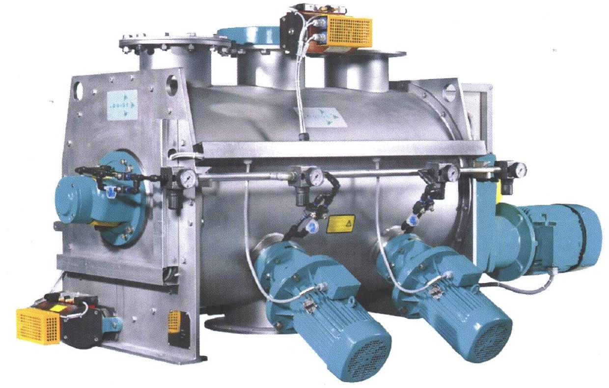 干粉攪拌機也稱為干粉混合機?;旌蠒r,機內物料受兩個相反方向的轉子作用,進行著復合運動,漿葉帶動物料方面沿著機槽內壁作逆時針旋轉,一方面帶動物料左右翻動,在兩轉子交叉重疊外形失重區,在此區域內,不論物料的形狀,大小,和密度如何,都能使物料上浮處于瞬間失重狀態,這使物料在機槽內形成全fang位連續循環翻動,相互交錯剪切,從而達到快速柔和混合均勻的效果.