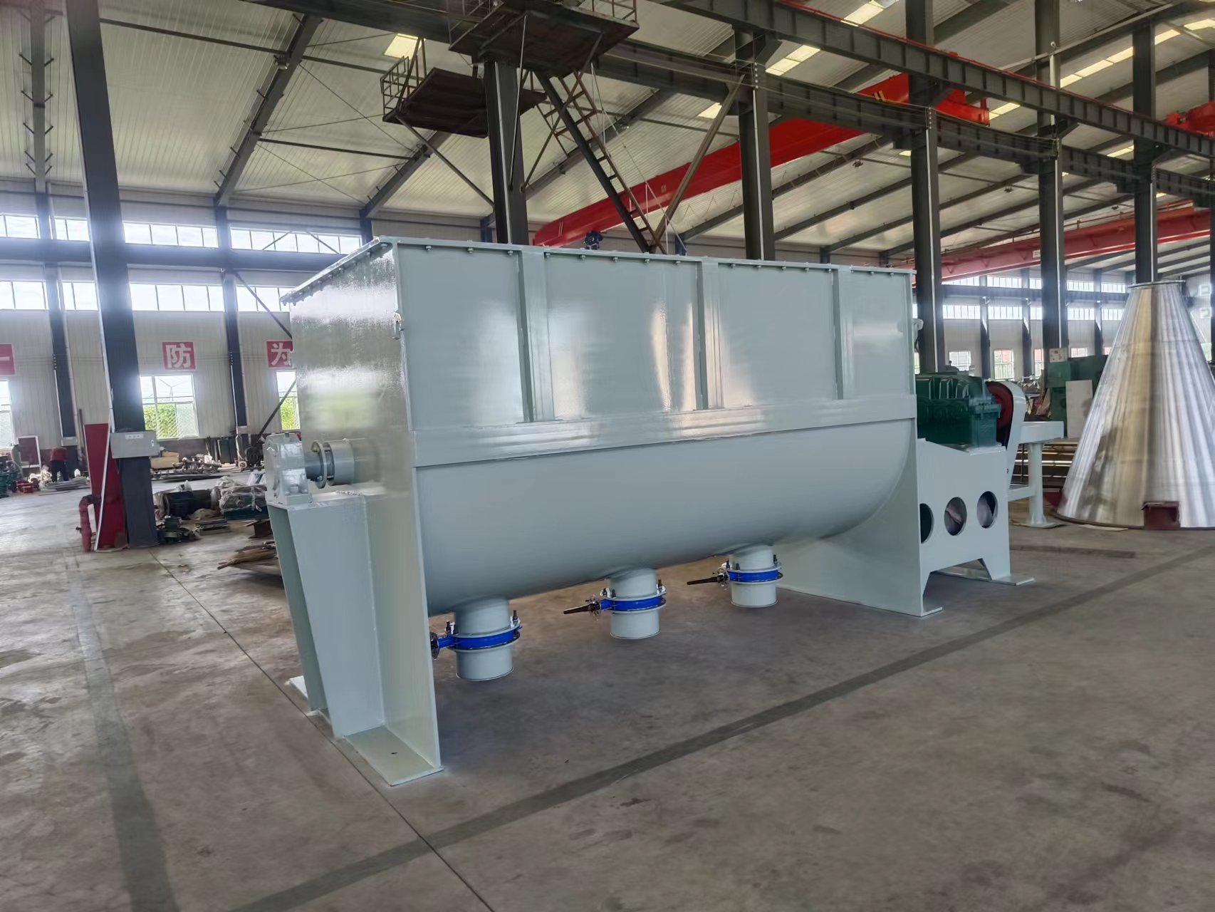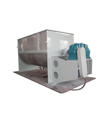 臥式螺帶混合機(jī)以高效、快速混合物料,在攪拌軸的螺旋帶運(yùn)動(dòng)下,使內(nèi)外螺旋帶在較大范圍內(nèi)翻動(dòng)物料,內(nèi)螺旋帶將物料向兩側(cè)運(yùn)動(dòng),外螺旋帶將物料由兩側(cè)向內(nèi)運(yùn)動(dòng),使物料來回?fù)交?另一部分物料在螺旋帶推動(dòng)下,沿軸向徑向運(yùn)動(dòng),從而形成對(duì)流循環(huán)。