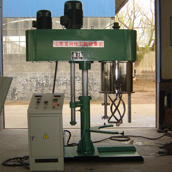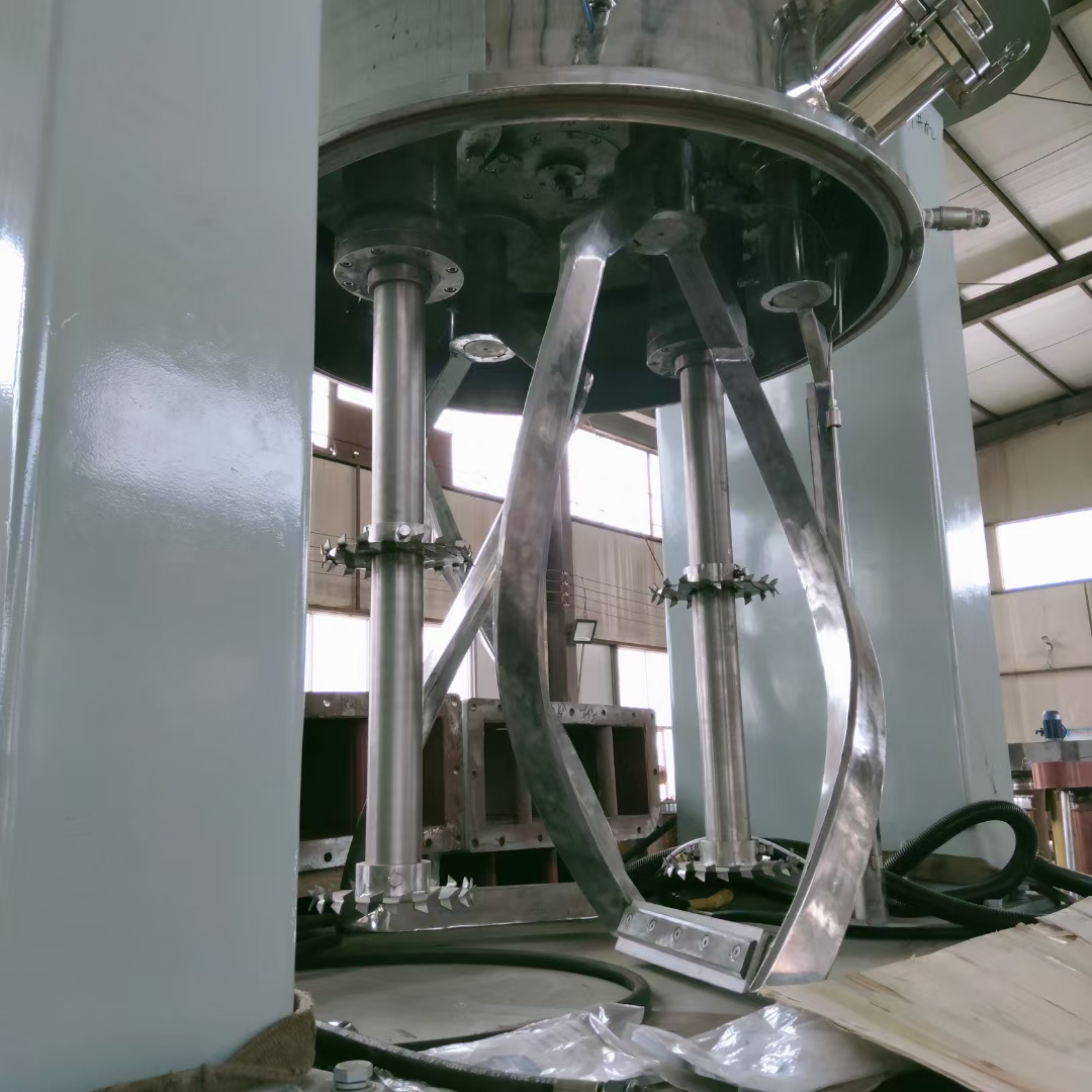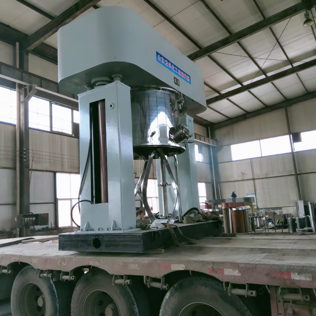 雙行星真空動力混合機工作過程中,兩支平行的攪拌槳按設定的固定旋轉比例運轉,沿攪拌桶公轉的同時亦快速自轉,同時攪拌桶內有隨公轉同步運轉的回旋刮板不停旋轉,使物料由攪拌桶內壁移動到攪拌槳附近,攪拌器的運轉方向與公轉可同向亦可逆向,達到不同剪切目的。另兩支單獨動力裝置的高速分散齒盤亦隨公轉一起沿攪拌桶內運轉,進行分散,乳化,高速分散齒盤為變頻調速,可根據生產工藝自定轉速。此類運動方式可使物料在較短時間內達到*均勻的乳化混合效果,特別適用于固固相、固液相、液液相的分散、混合